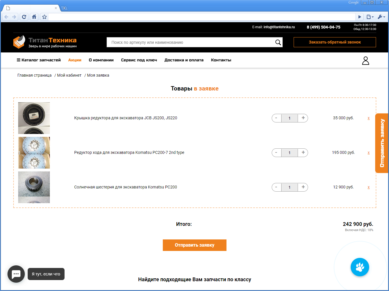 Перед созданием сайта наши специалисты сразу учли, что у клиента количество товаров постоянно увеличивается. Поэтому от простой категоризации решено было отказаться. Мы сформировали полноценный каталог с сортировкой по пяти фильтрам: класс запчасти, подкласс, марка, модель, тип техники. Можно каждый из фильтров комбинировать с другими или применять сразу несколько.